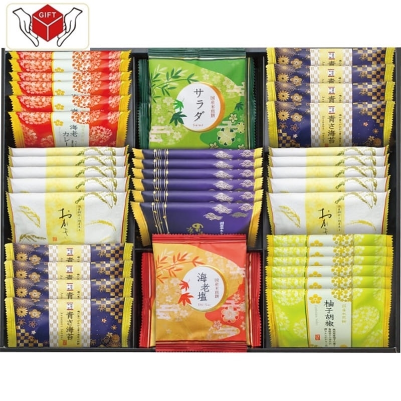 ●黒豆おかき×10、青さ海苔煎餅×8、のり巻あられ×6、柚子胡椒煎餅×6、