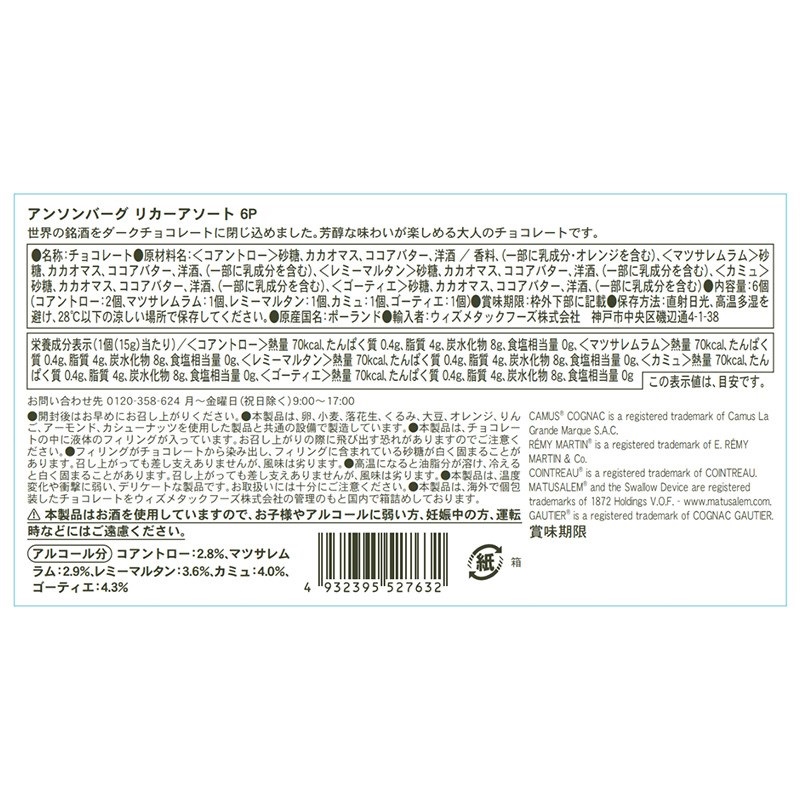 世界の銘酒が入ったリカー入りダークチョコレート6個箱。