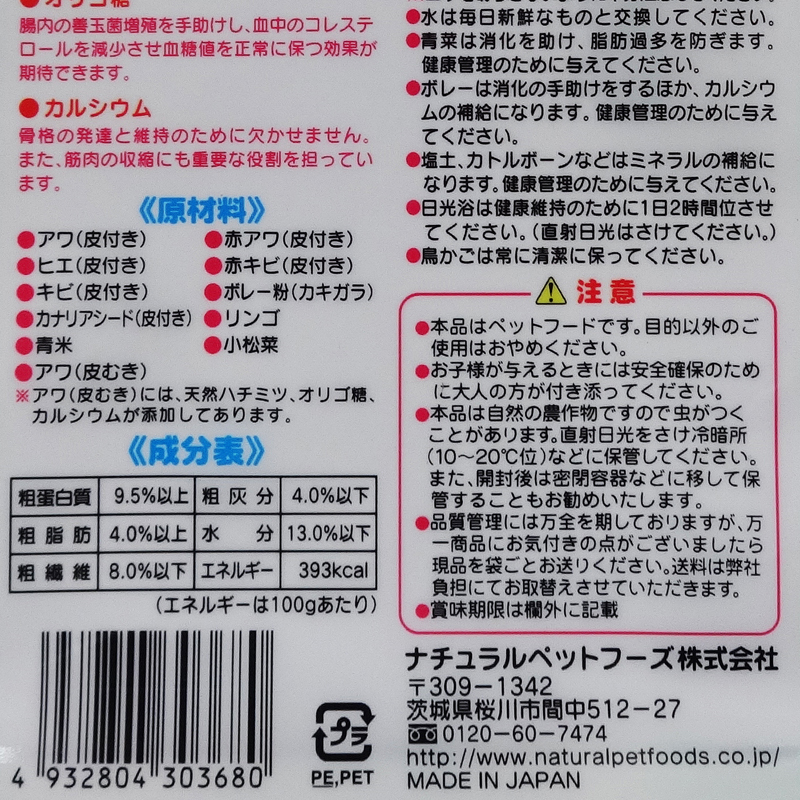 - アワ(皮付)、ヒエ(皮付)、キビ(皮付)、カナリアシード(皮付)、青米、アワ(皮ムキ)、