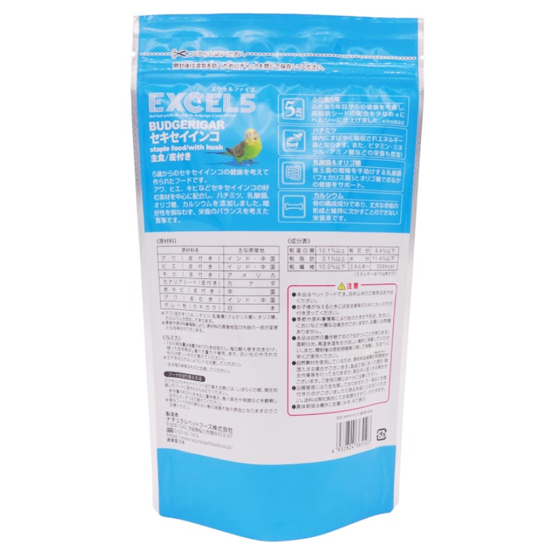 セキセイインコの好む素材を中心に配合し、ハチミツ、乳酸菌、オリゴ糖、カルシウムを添加しました。