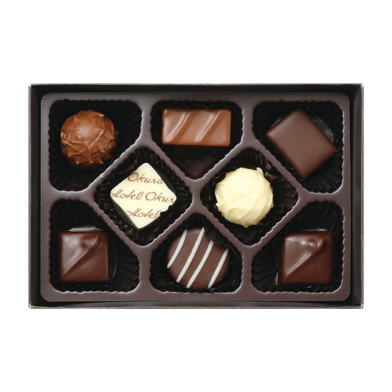 ミルク、ホワイトのトリュフと、ナッツや塩を使用したショコラ、ロゴがプリントされた