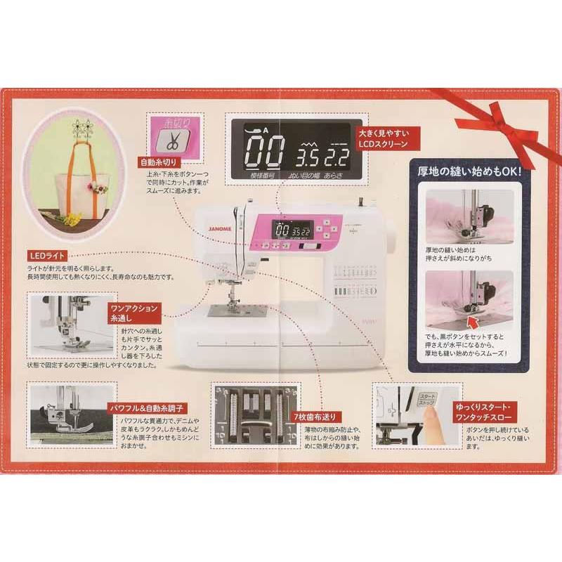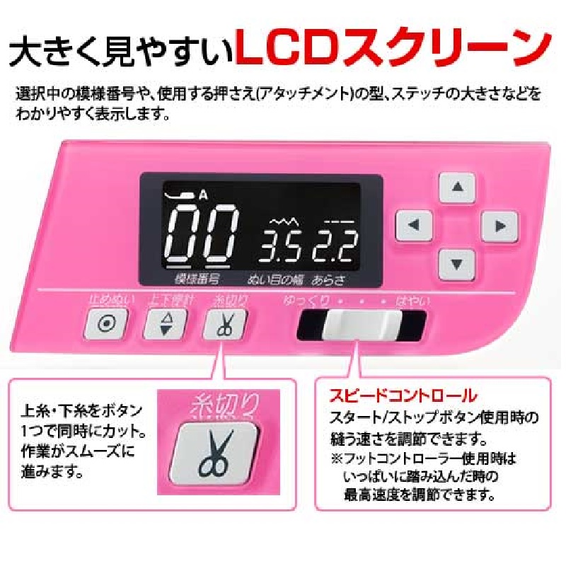 主な機能:自動糸調子/自動糸切り/ワンアクション糸通し/LED手元ランプ/針上下停止ボタン/返し縫い