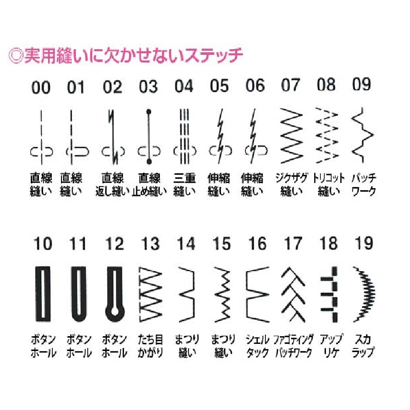 模様数:20種類(ステッチ17種+ボタンホール3種)