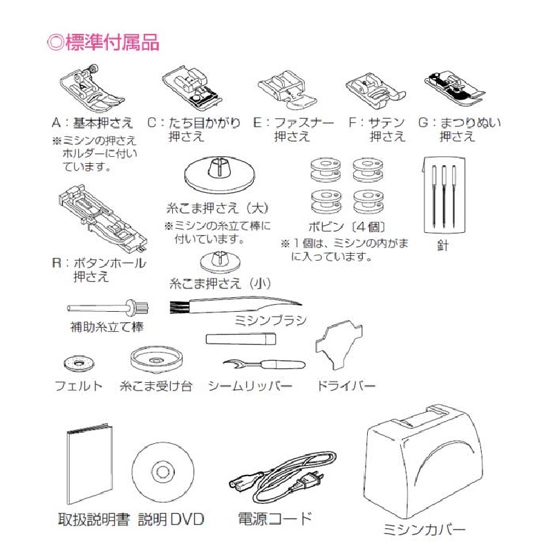 ・ボタンホール押さえ)、針セット、ボビン、ドライバー、シームリッパー、糸立棒、