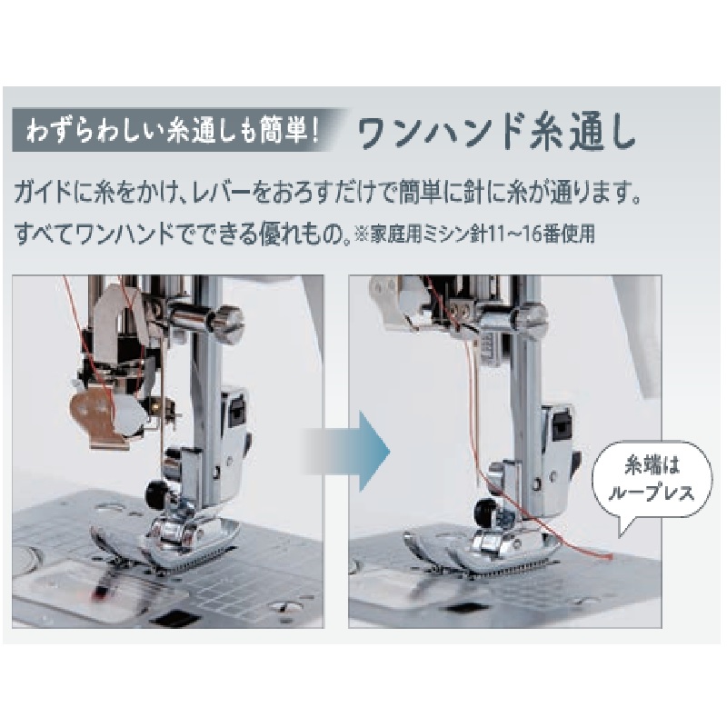 ・ガイドに糸をかけ、レバーをおろすだけで簡単に針に糸が通ります。すべてワンハンドでできる優れもの。