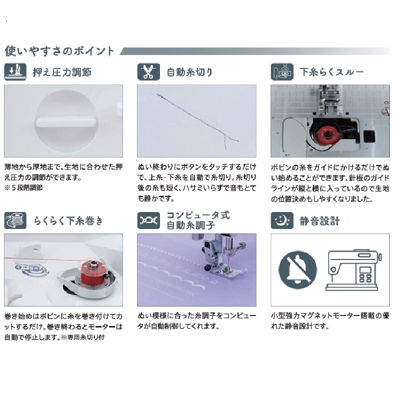 ・薄地から厚地まで、生地に合わせた押え圧力調節ができます。※5段階調節