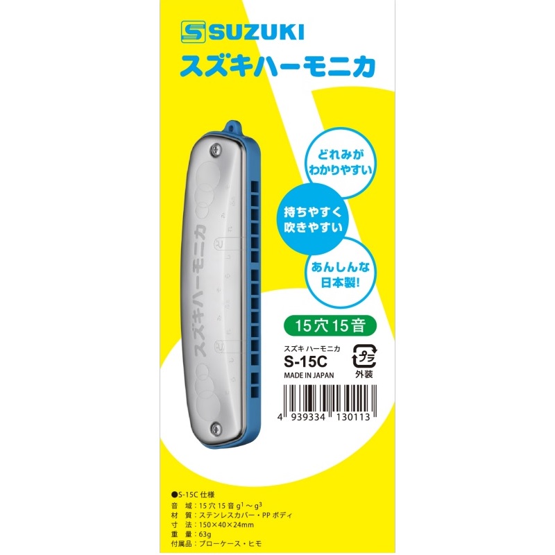 音階が順番に並んでいる正常配列の15音教育用ハーモニカです。