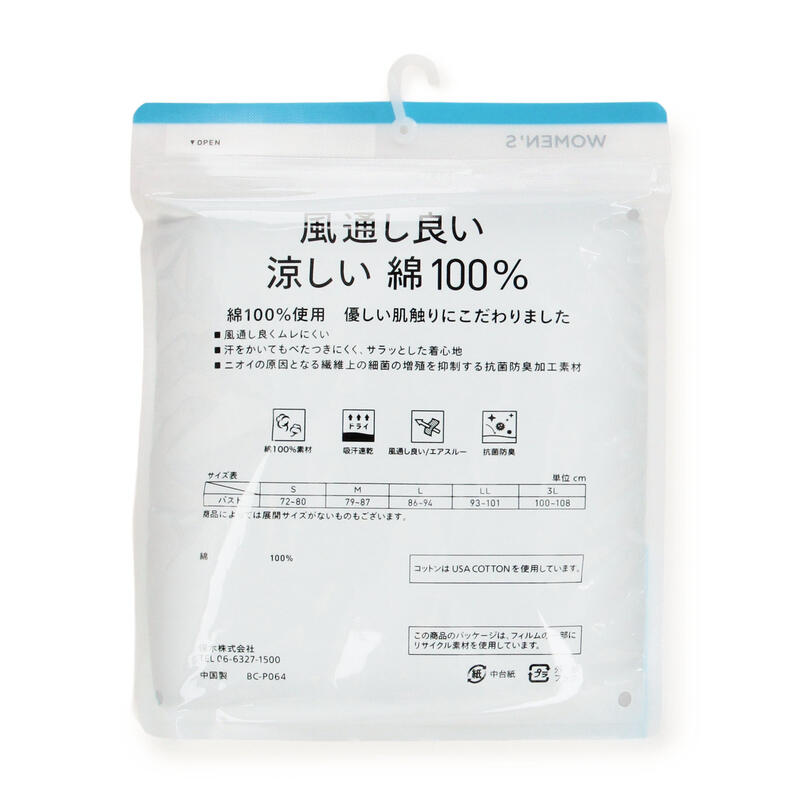 風通しが良くムレにくい涼しい綿100%商品であり、吸汗速乾性と抗菌防臭性も兼ね備えています。