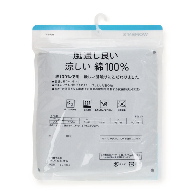 風通しが良くムレにくい涼しい綿100%商品であり、吸汗速乾性と抗菌防臭性も兼ね備えています。