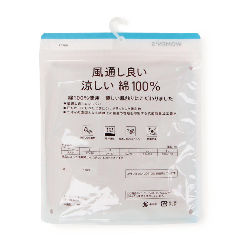 風通しが良くムレにくい涼しい綿100%商品であり、吸汗速乾性と抗菌防臭性も兼ね備えています。