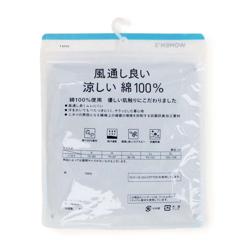 風通しが良くムレにくい涼しい綿100%商品であり、吸汗速乾性と抗菌防臭性も兼ね備えています。