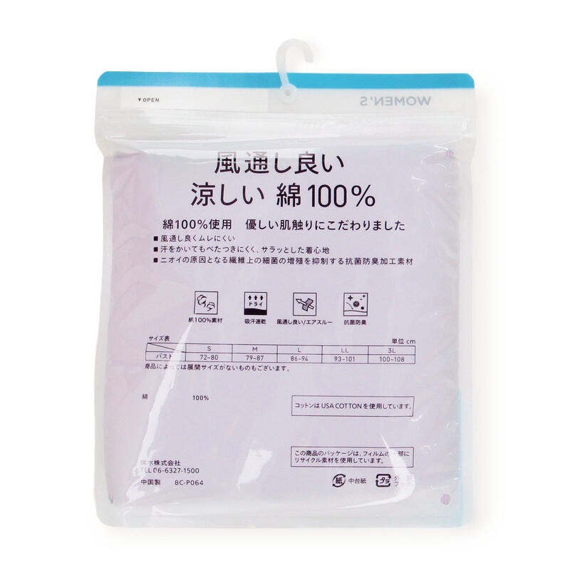 風通しが良くムレにくい涼しい綿100%商品であり、吸汗速乾性と抗菌防臭性も兼ね備えています。
