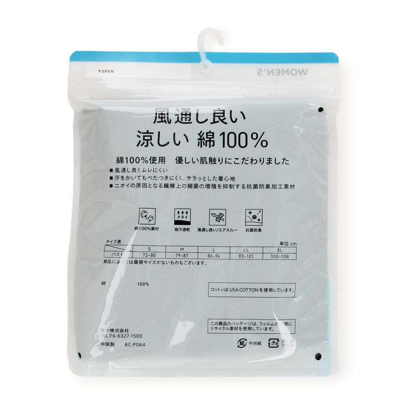 風通しが良くムレにくい涼しい綿100%商品であり、吸汗速乾性と抗菌防臭性も兼ね備えています。