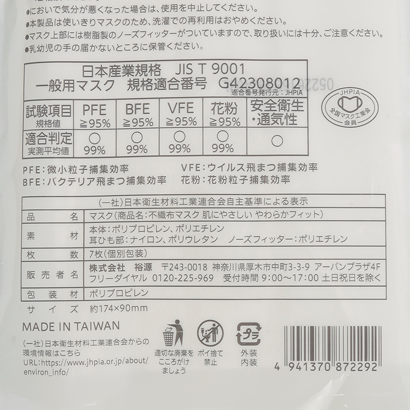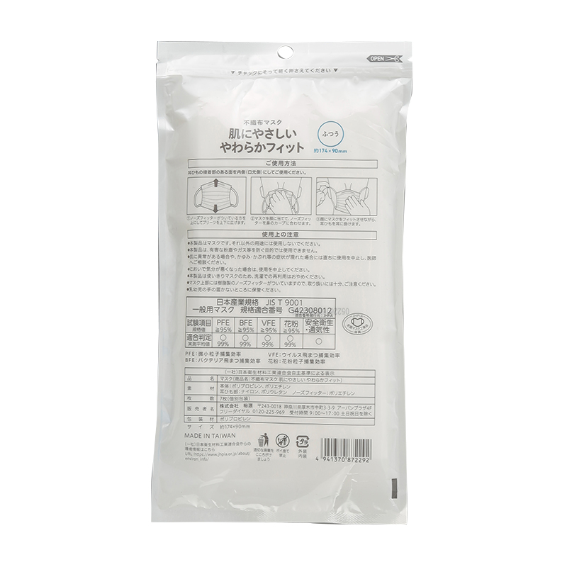 - 本体:ポリプロピレン、ポリエチレン 耳ひも部:ナイロン、ポリウレタン ノーズフィッター:ポリエチレン