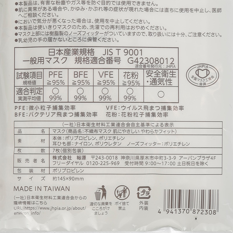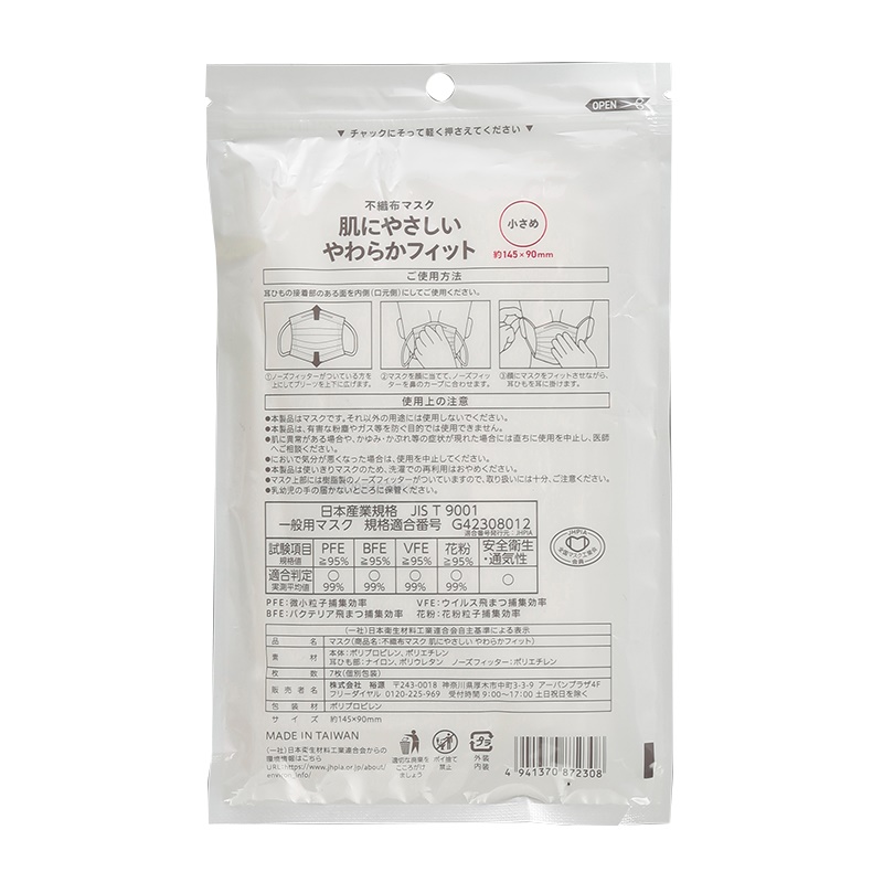 - 本体:ポリプロピレン、ポリエチレン 耳ひも部:ナイロン、ポリウレタン ノーズフィッター:ポリエチレン