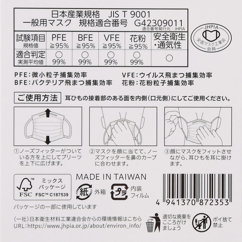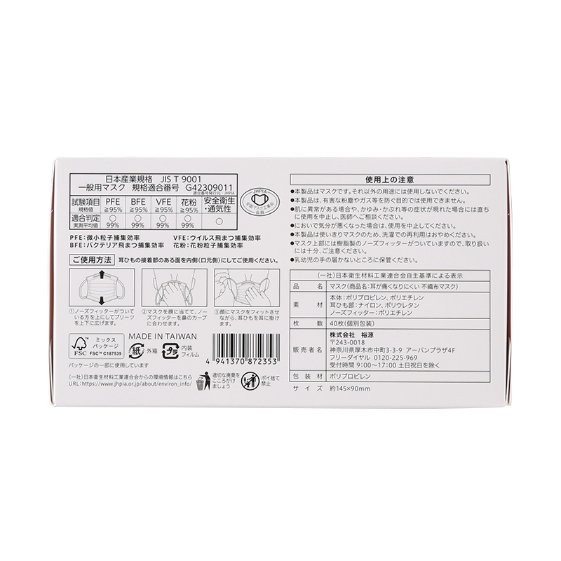 - 本体:ポリプロピレン、ポリエチレン 耳ひも部:ナイロン、ポリウレタン ノーズフィッター:ポリエチレン