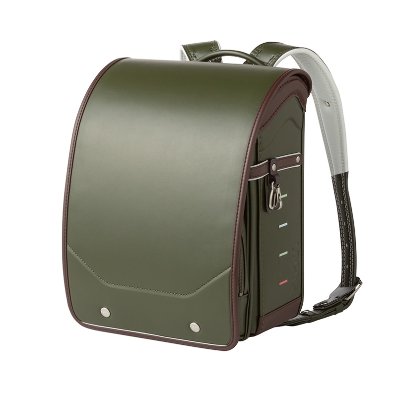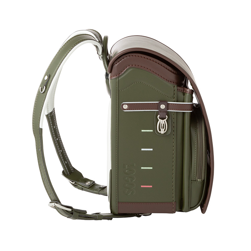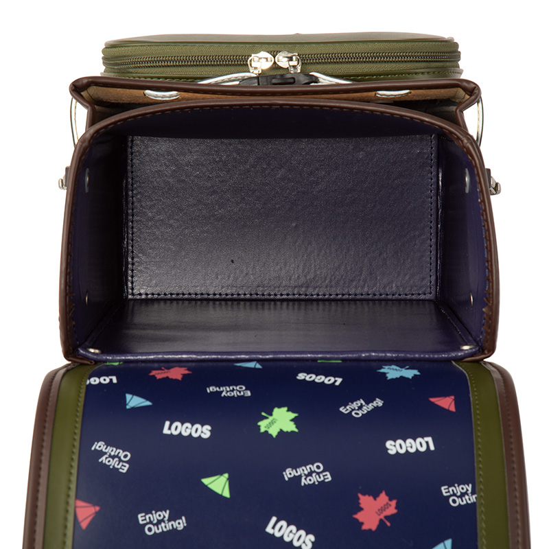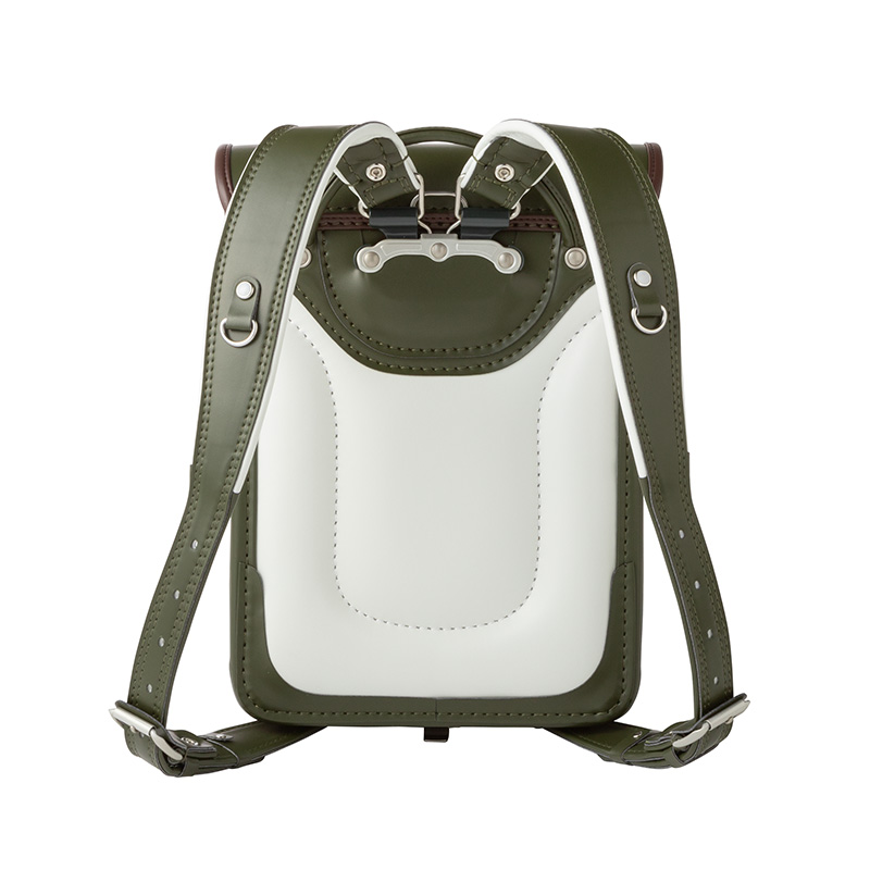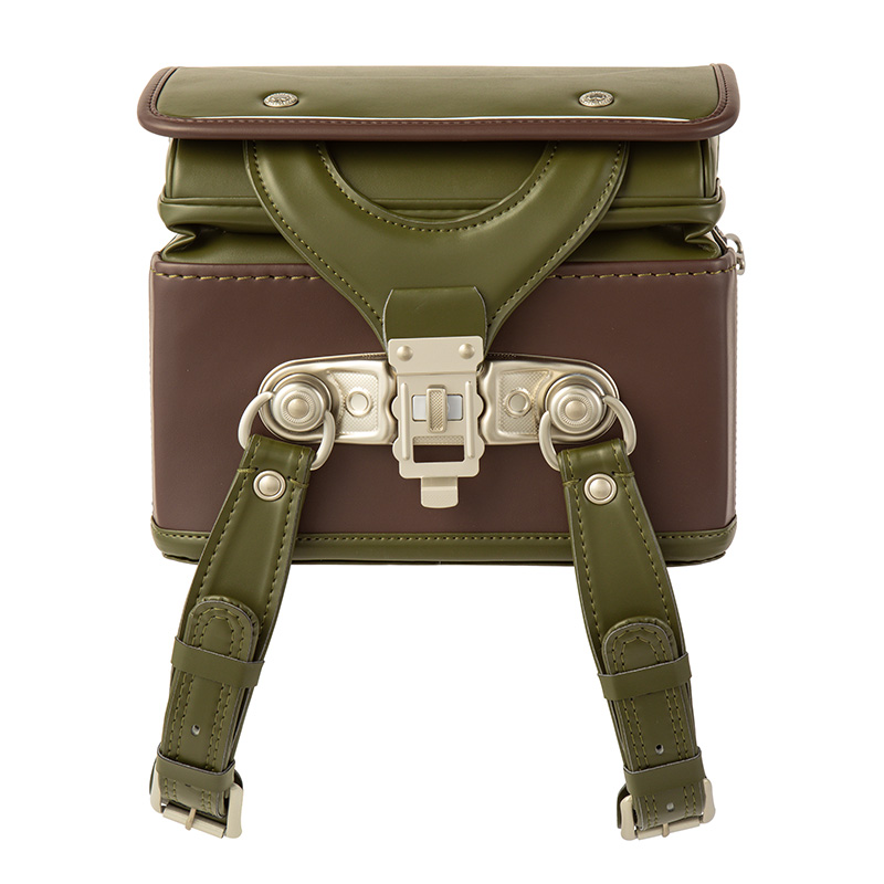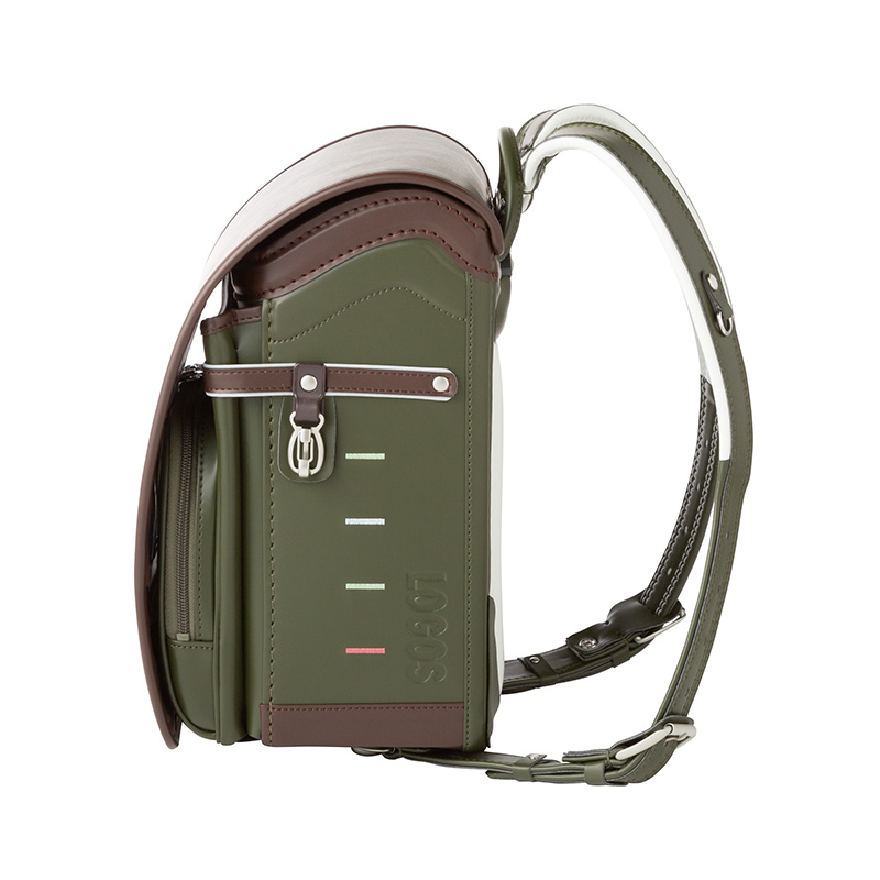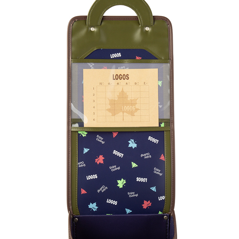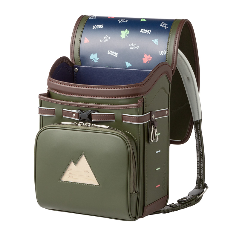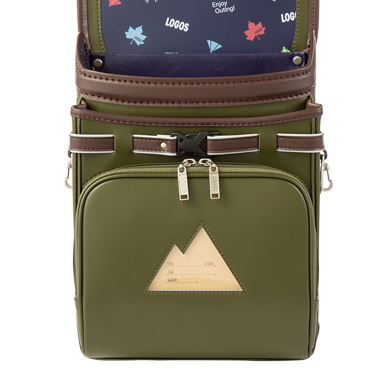 ベルト留めをバックル留めにし、ロゴスのブランドカラーであるオリジナルのグリーン色や
