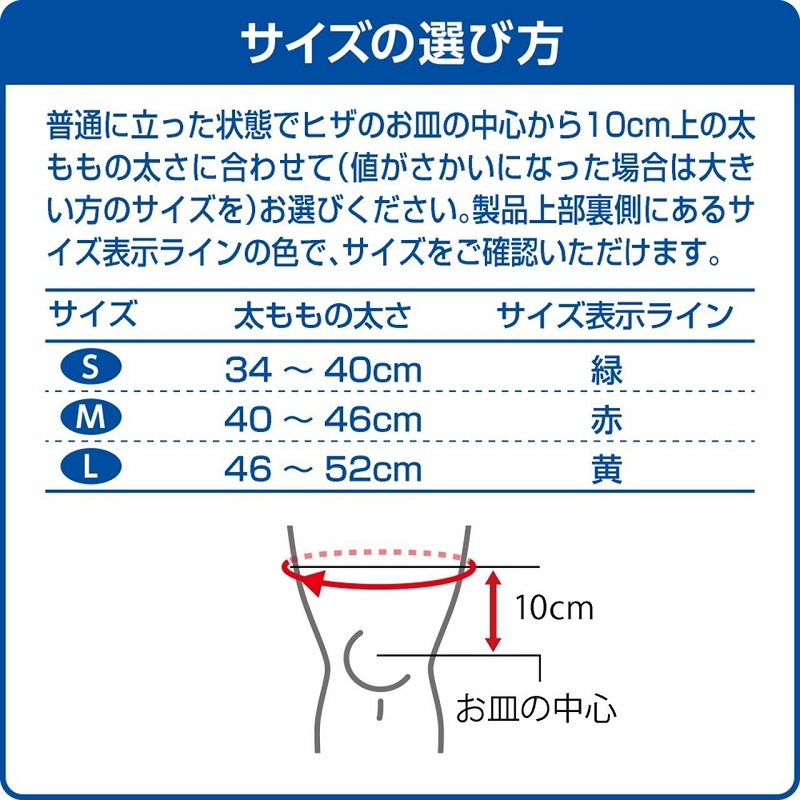 普通に立った状態でヒザのお皿の中心から10cm上の太ももの太さに合わせて