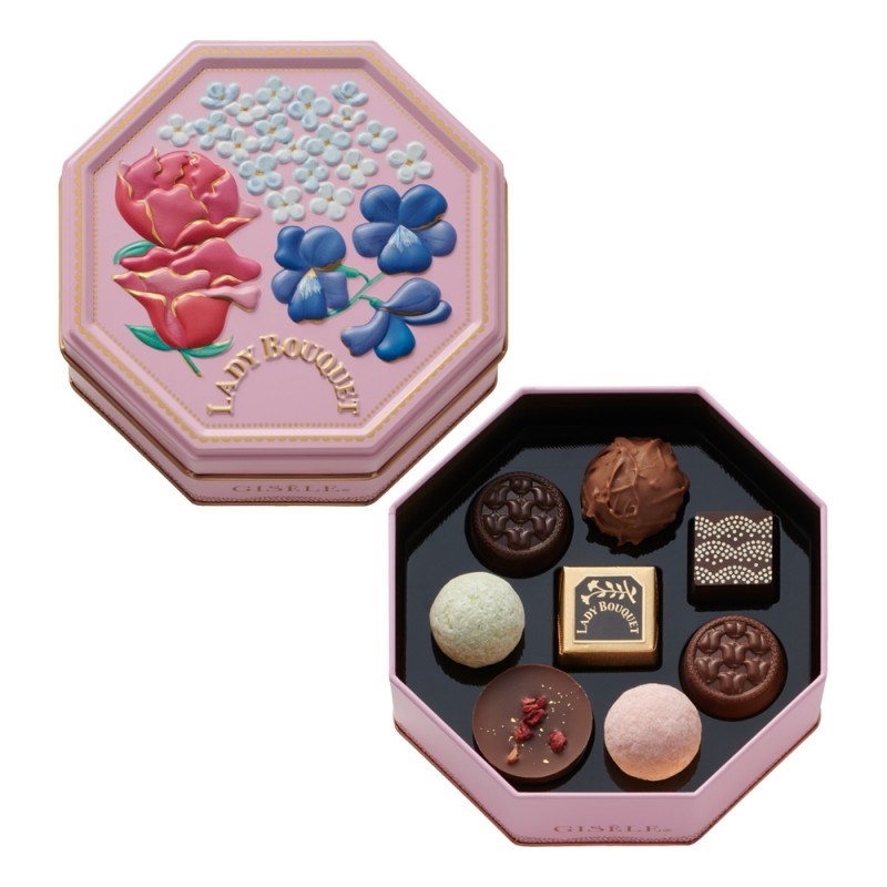 喜びあふれる花束をイメージしたフェミニンな缶入りチョコレート。