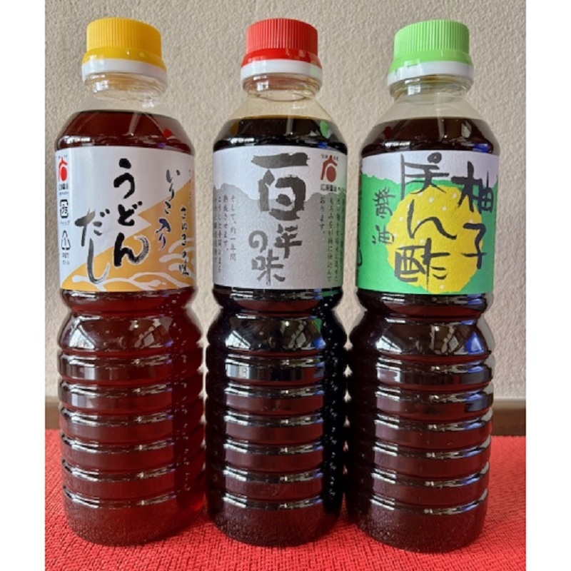 いりこ入りうどんだし500ml×1、百年の味(濃口醤油)500ml×1、