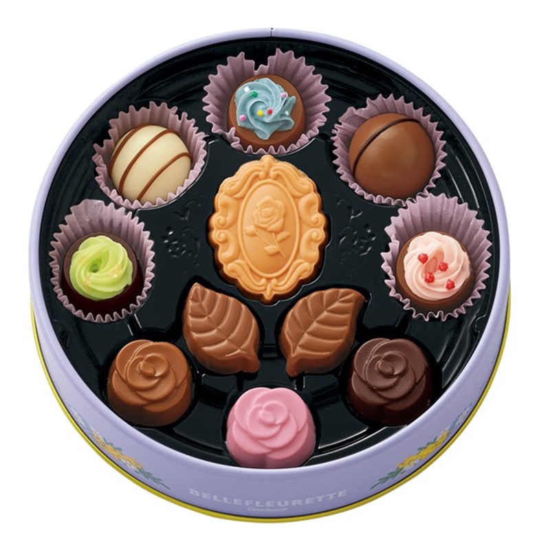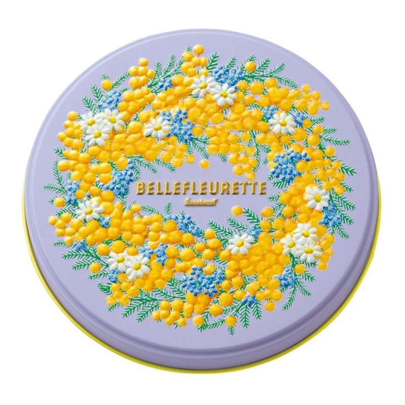 春の花をイメージしたエンボス加工の丸缶に、小さいカップケーキ型チョコレートなど