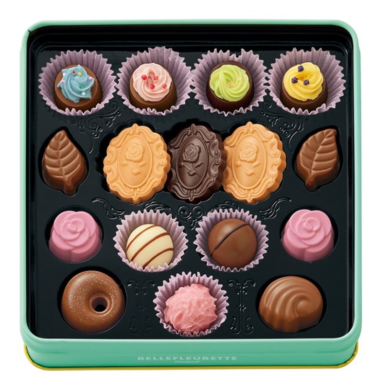 「春」「花」をイメージしたパッケージの四角缶に、様々なチョコレートを16個詰め合わせました。