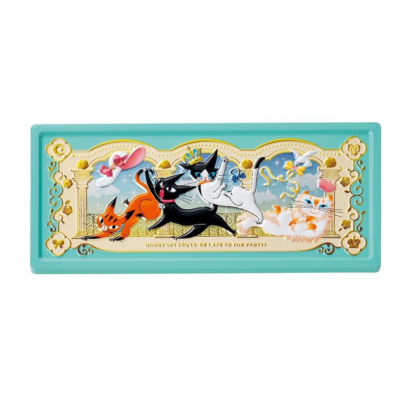 パーティー会場に向かう4匹を描いた缶に、4匹のプリントチョコレートや
