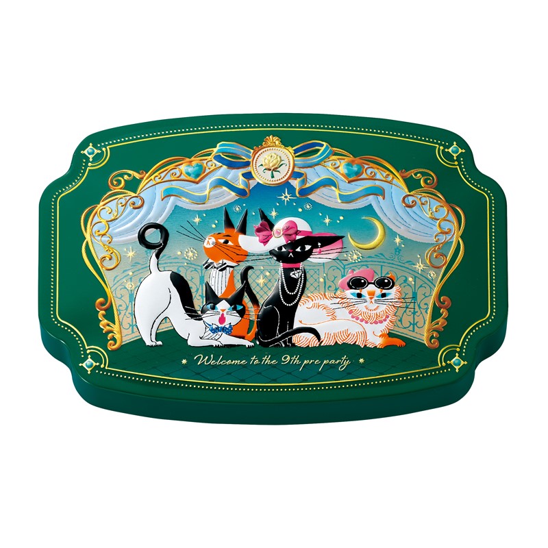 プレパーティー会場でポーズをとるアンジュジュたちを描いた缶に、猫型プリントチョコレートや、