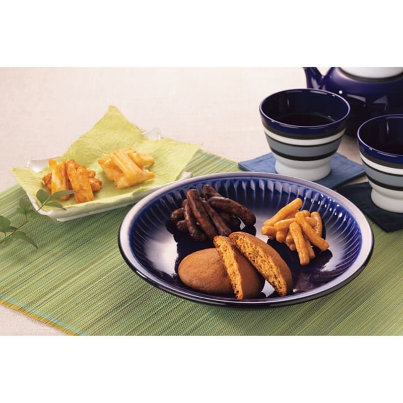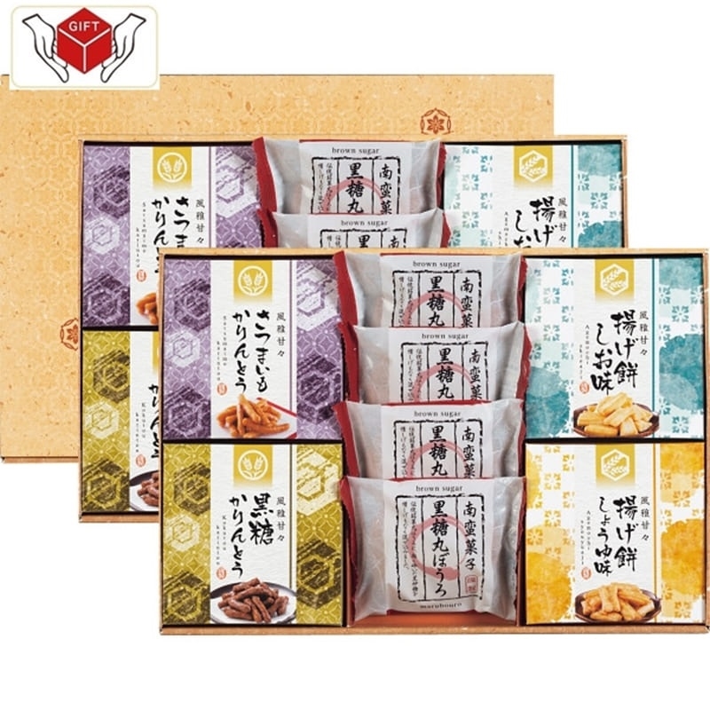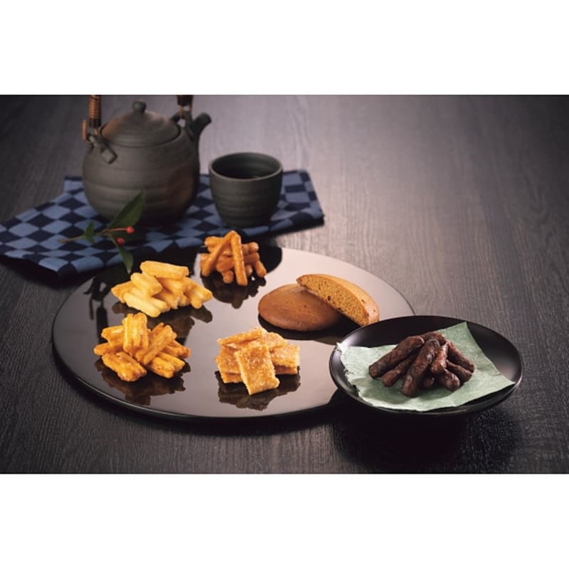 ●黒糖丸ぼうろ×8、揚げ餅(しお・醤油)各20g×各2、さつまいもかりんとう・黒糖かりんとう各30g×各2(2段重ね)