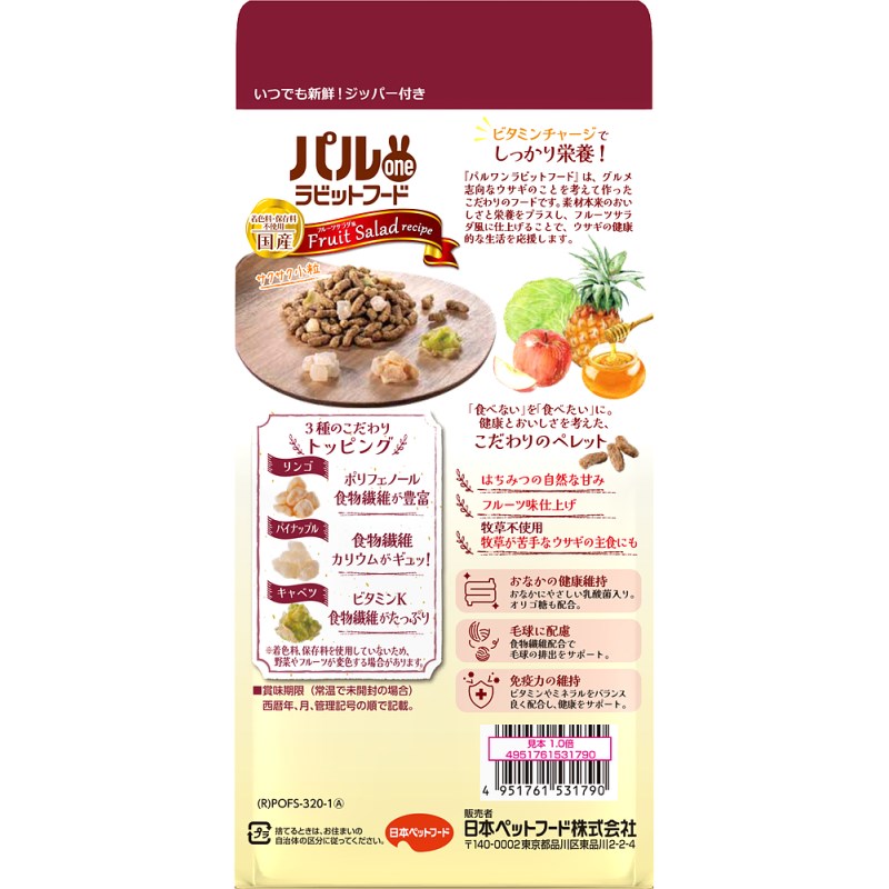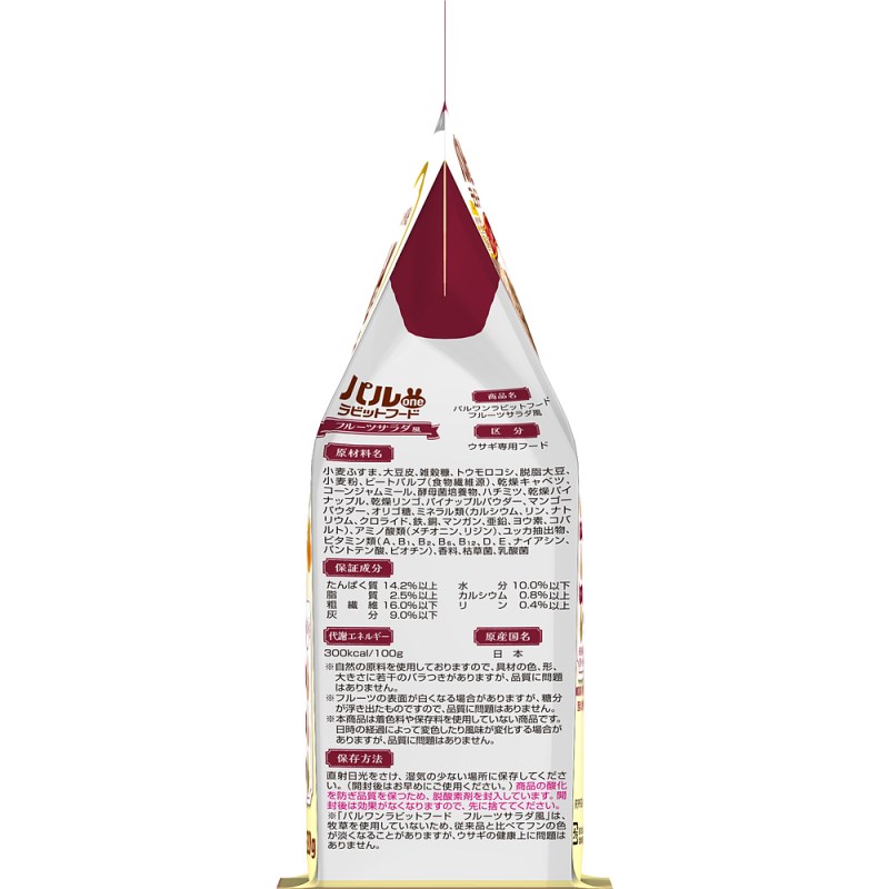 ・ウサギが大好きなリンゴ、パイナップル、キャベツの3種類の乾燥果物&野菜をトッピングし、おいしさと栄養をプラスしました。