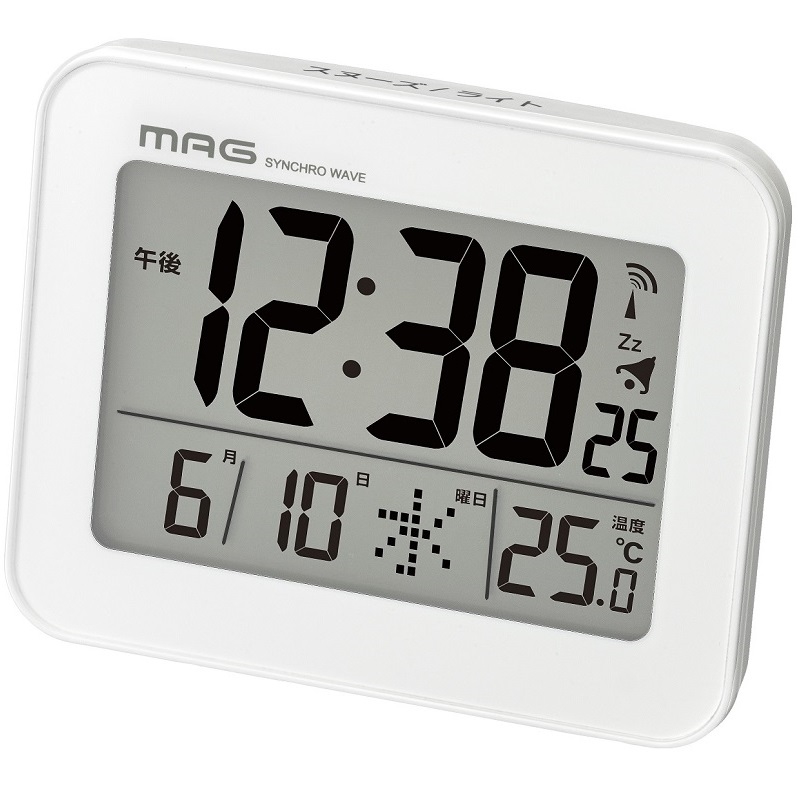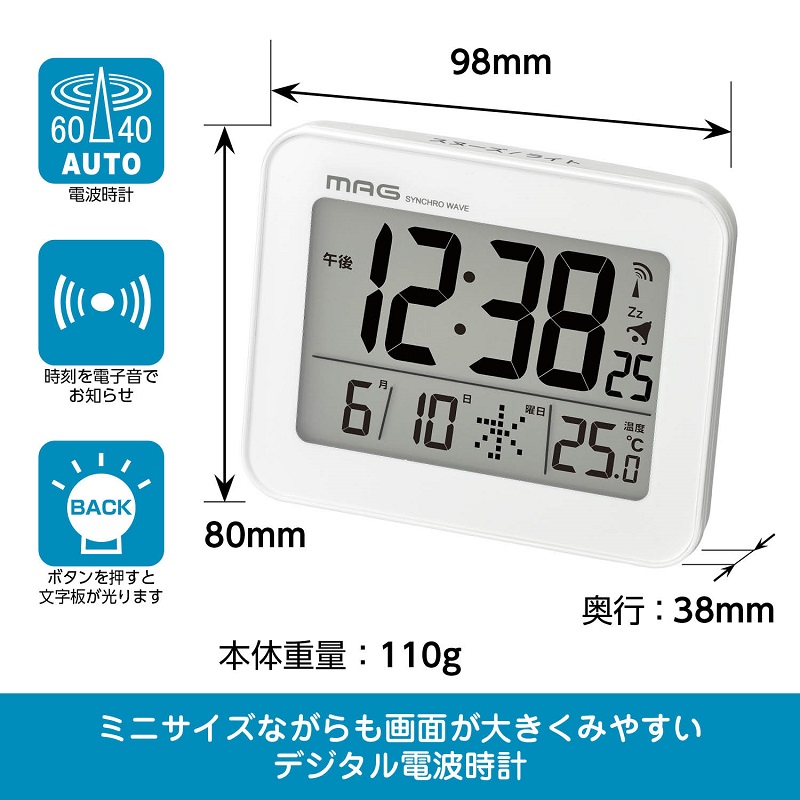 温度表示(-9.9~+59.9℃)、電波受信状況表示、12/24時間表示切替