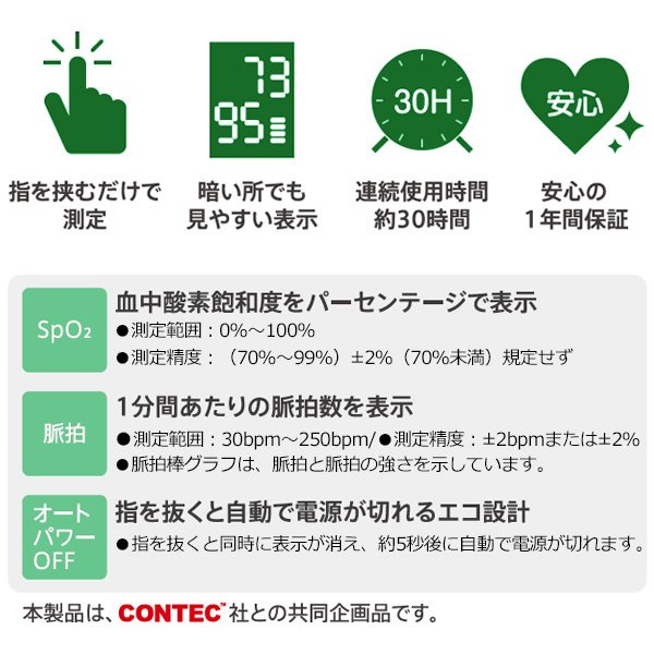 Sp02:(測定範囲)0~100% (測定精度)+-2%(70~99%)