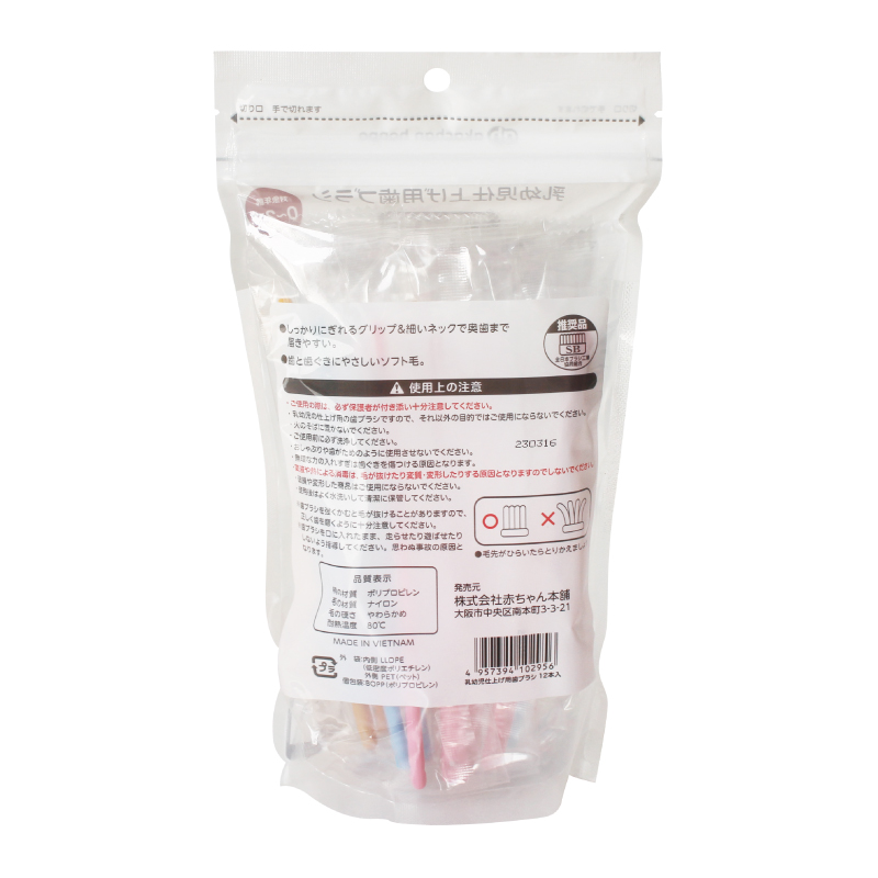 リーズナブルさとシンプルさコンパクトさを追求した0~2歳向けの乳幼児仕上げ用歯ブラシです。