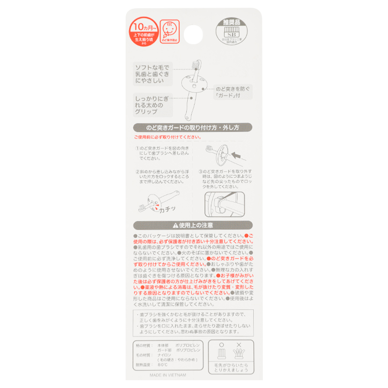しっかりにぎれる太めのグリップで仕上げみがきにも使いやすい。のど突きを防ぐガード付。