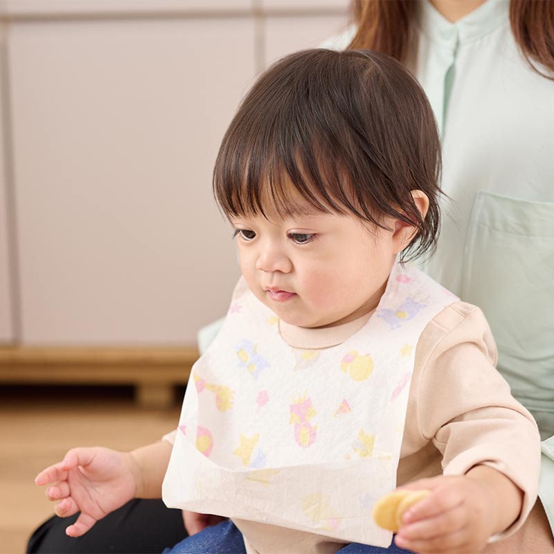 3層式で漏れにくく、やさしい肌触り。口元から近いポケットで食べこぼしをキャッチします。