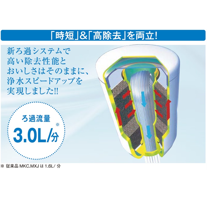 「時短&高除去」カートリッジに長持ちタイプ新登場!1500リットル寿命の長持ち5ヶ月寿命。JIS13項目高除去タイプ。安心・美味しい水がすぐにたっぷり使える。そして長持ち!