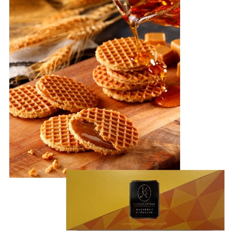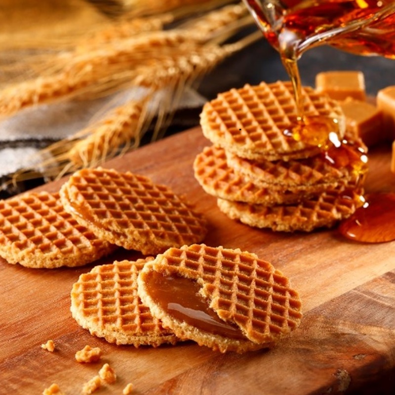 薄焼きの生地にメープルを加え、さらに薄くスライスしてシナモンの香るキャラメルシロップをサンドしたストロープワッフルです
