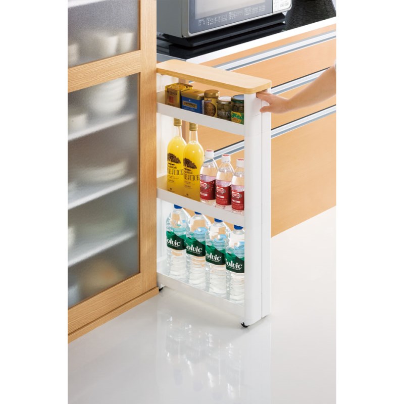 冷蔵庫や食器棚の隙間にキャスター付で出し入れしやすい収納ワゴン