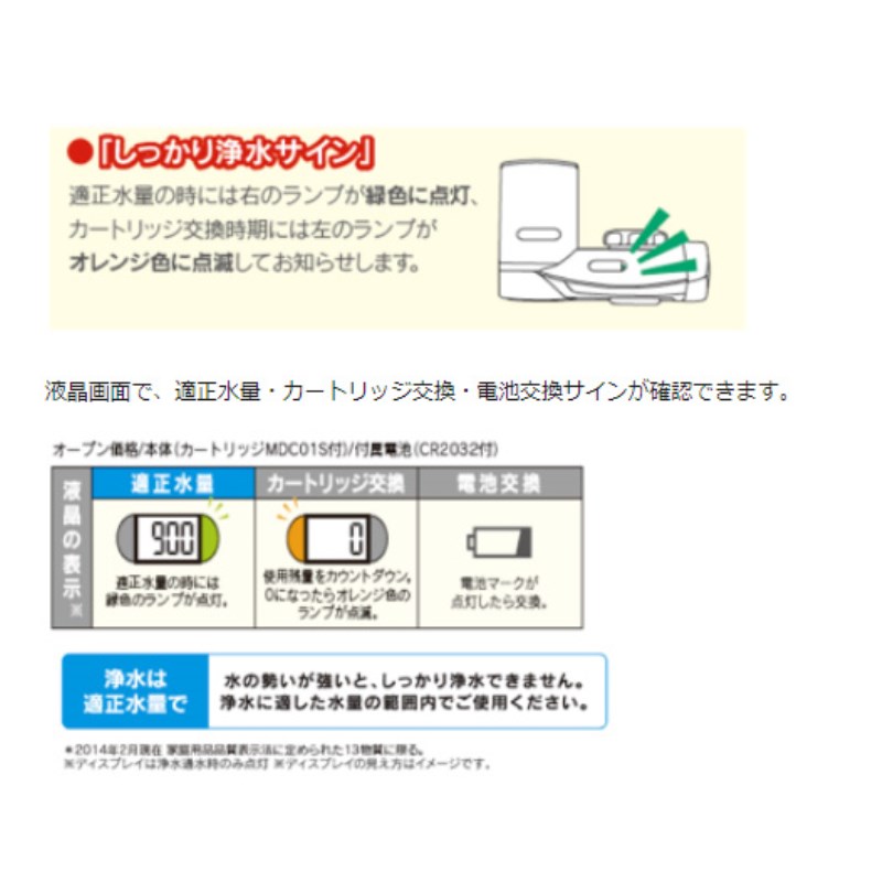 液晶画面で、適正水量・カートリッジ交換・電池交換サインが確認できます。