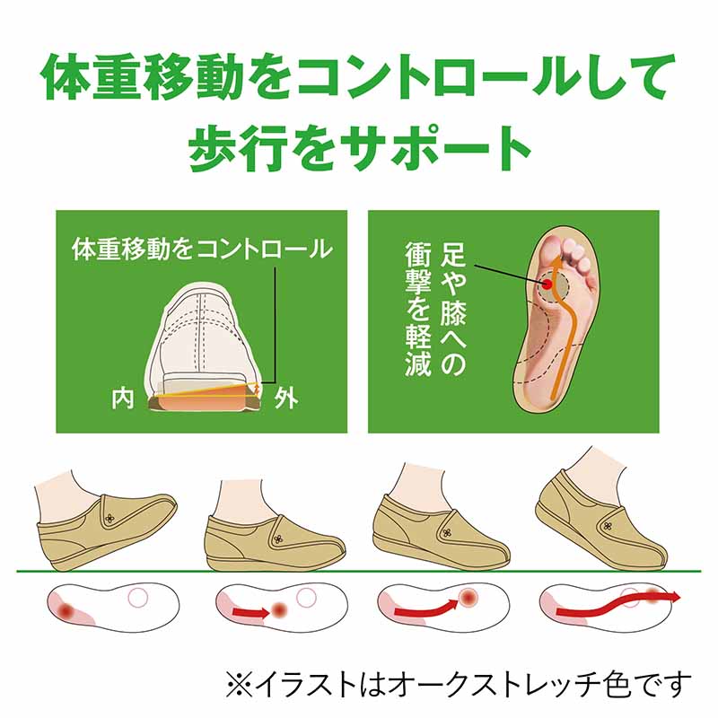 ひざの負担を軽減し、体重移動をサポートする「フットオンコントローラーシステム」を採用した超軽量シューズ。