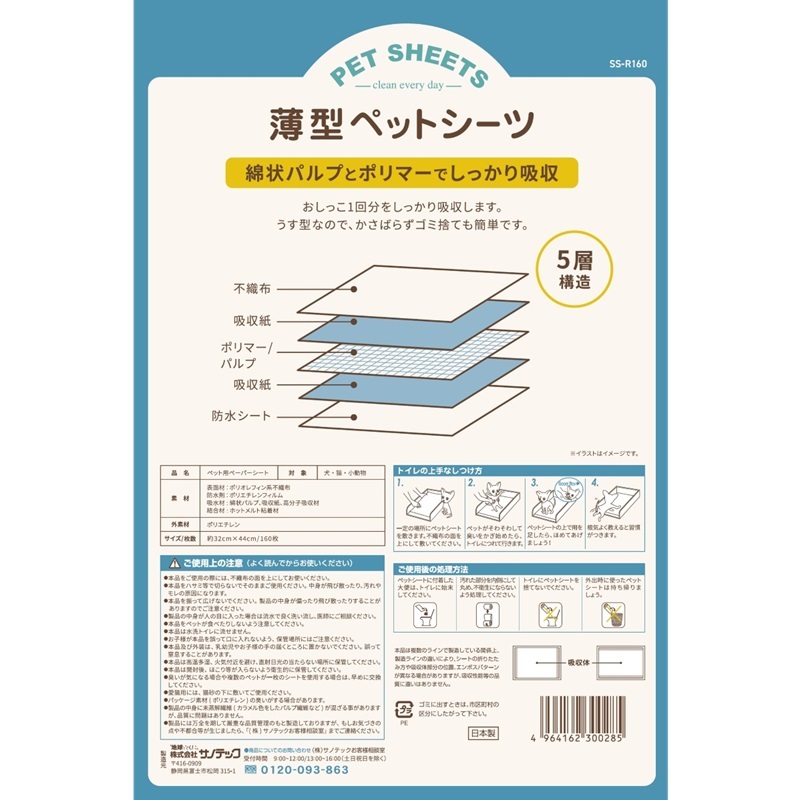 - 【素材】表面材:ポリオレフィン系不織布、防水材:ポリエチレンフィルム、吸水材:綿状パルプ・吸収紙・高分子吸収材、