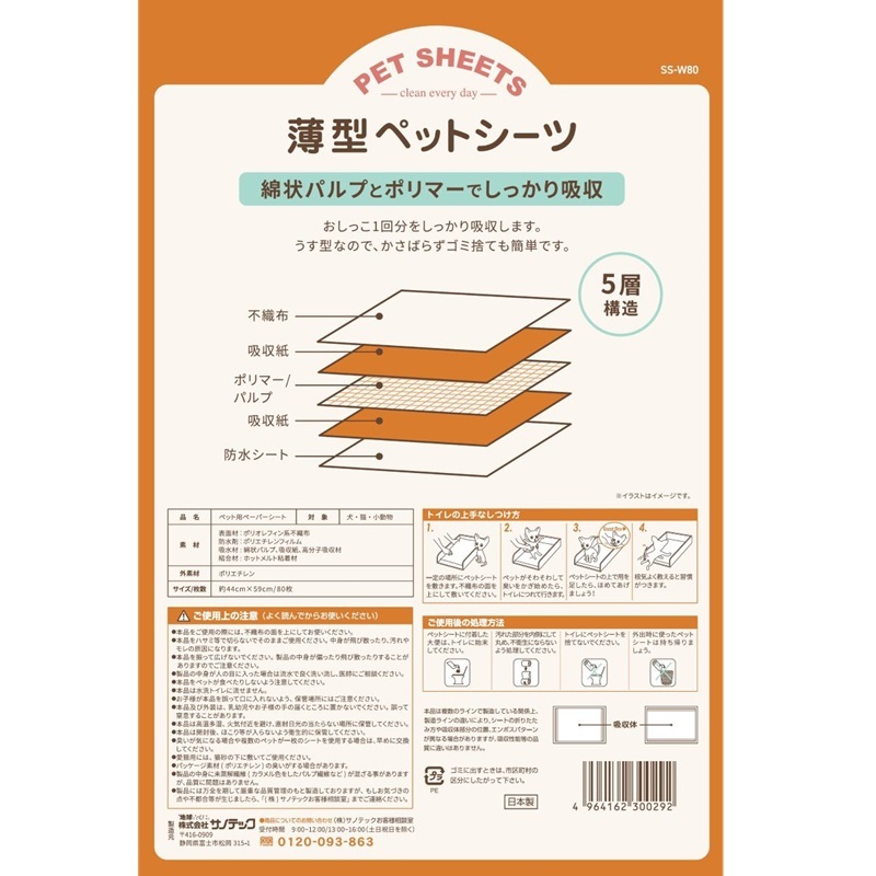 - 【素材】表面材:ポリオレフィン系不織布、防水材:ポリエチレンフィルム、吸水材:綿状パルプ・吸収紙・高分子吸収材、