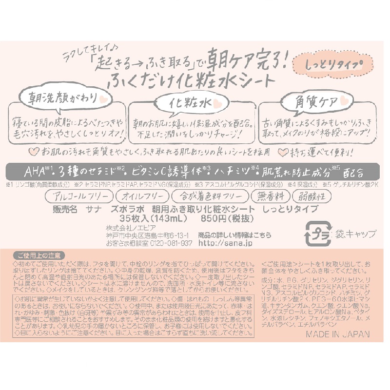 寝ている間の毛穴汚れや余分な皮脂、古い角質もふくだけで簡単にオフ。面倒な朝の洗顔&化粧水(保湿)の2役を担い、