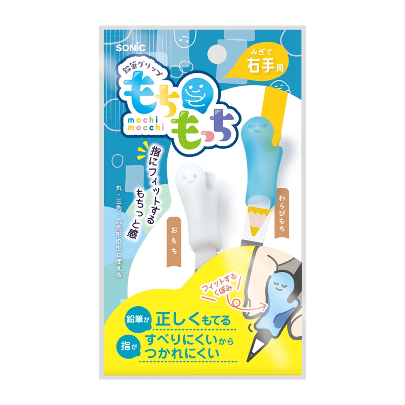 笑ったりはしゃいだり、表情豊かなグリップのおもち達。鉛筆を握った時に、おもちのお顔が見える向きが正しい装着向きです。