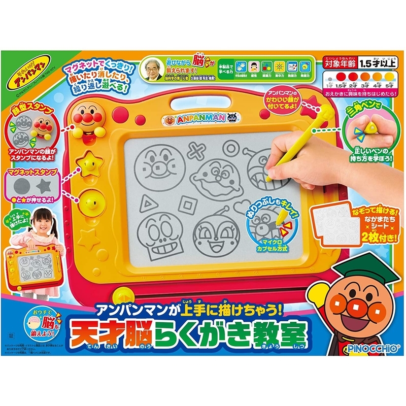 アンパンマンの顔が付いた「三角軸ペン」が付属し、楽しくお絵かきできる、らくがき教室が新しくなって登場です。