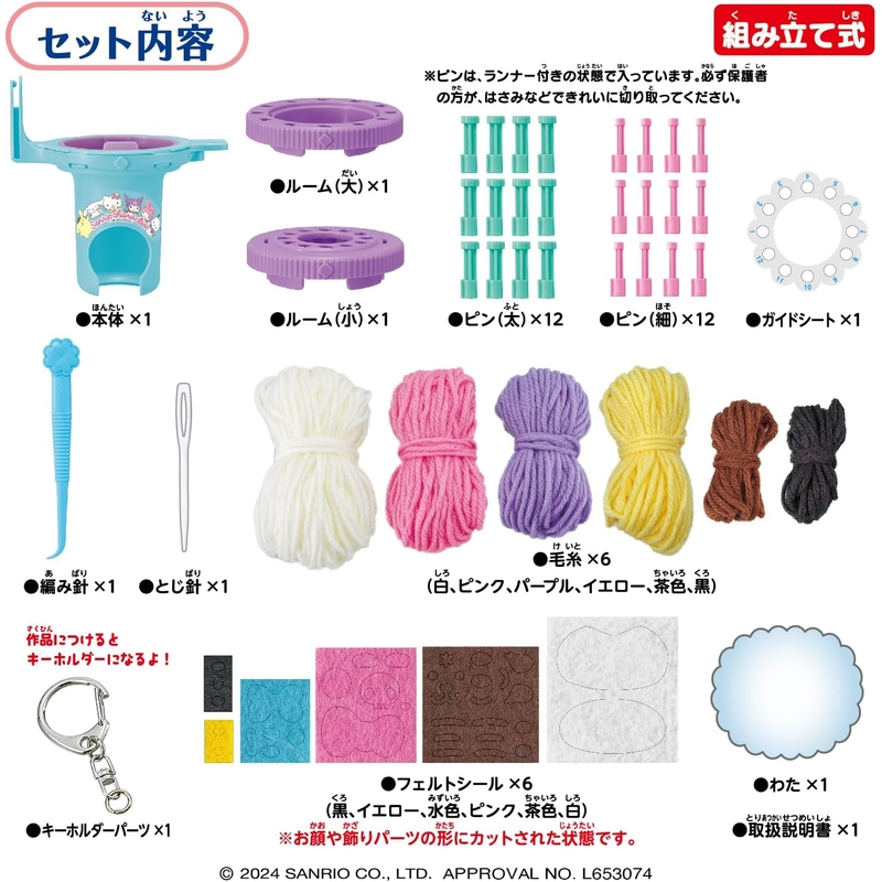 編み針×1、 とじ針×1、 わた×40g、キーホルダーパーツ×1、 ガイドシート×1、 取扱説明書×1