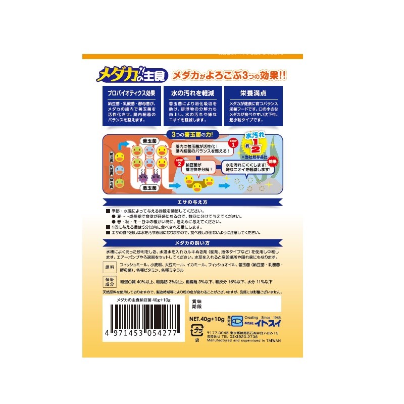 メダカの成長に必要な栄養がたっぷりの、納豆菌入り高たんぱくフードです。メダカが食べやすい粉末タイプのエサ。