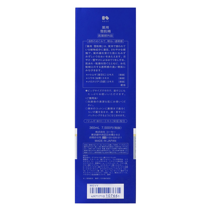 日やけ、雪やけによるほてりをしずめ、肌あれ、乾燥を防ぐと共に、お化粧映えのする透明感の高い素肌に導く化粧水のビッグサイズ