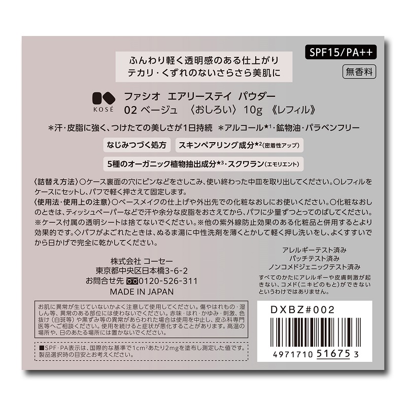 コーセー ファシオ エアリーステイパウダー(レフィル) 002