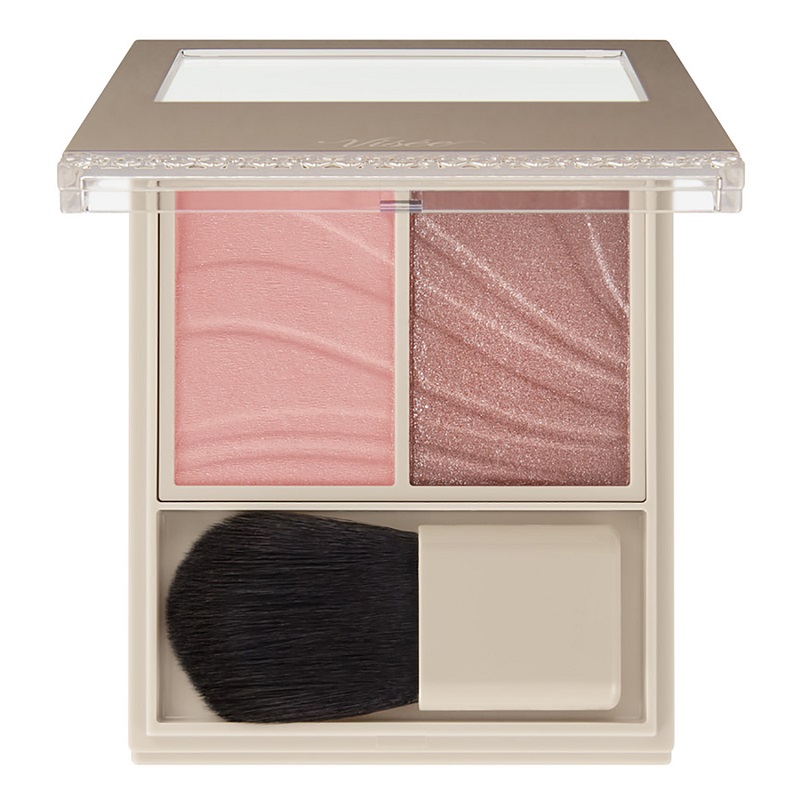 ベースで頬を整えて色を重ね、花びらのような血色感×立体ツヤを生み出す。マットベースとパールカラーの2質感チークカラー